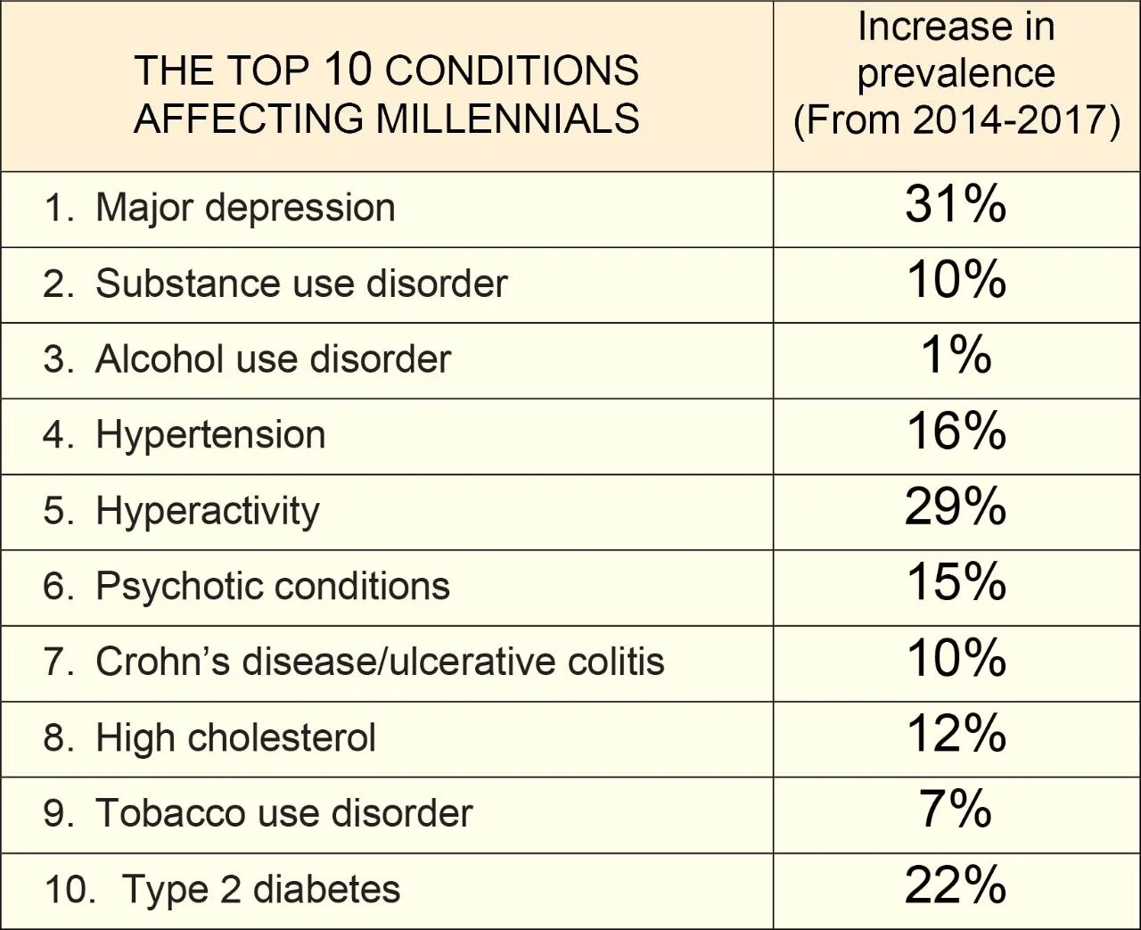 Only 49% of millennials view their mental health as good or excellent. Millennial women are 20% less healthy than their male counterparts, with depression being one of the main ailments. [1]